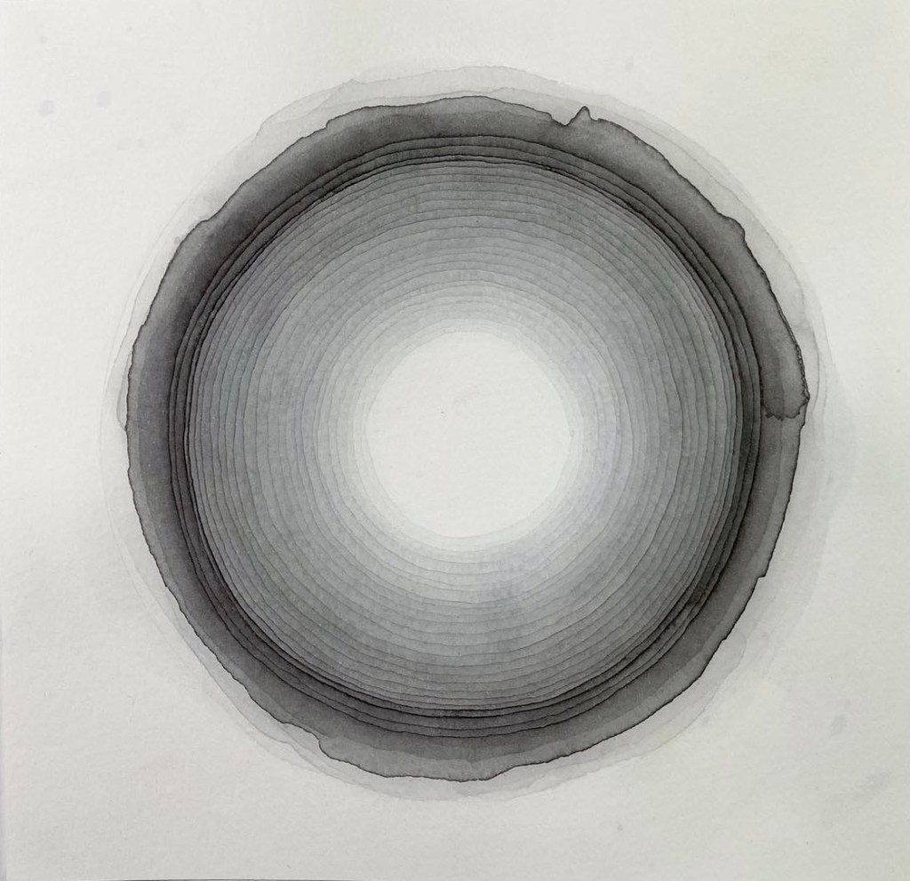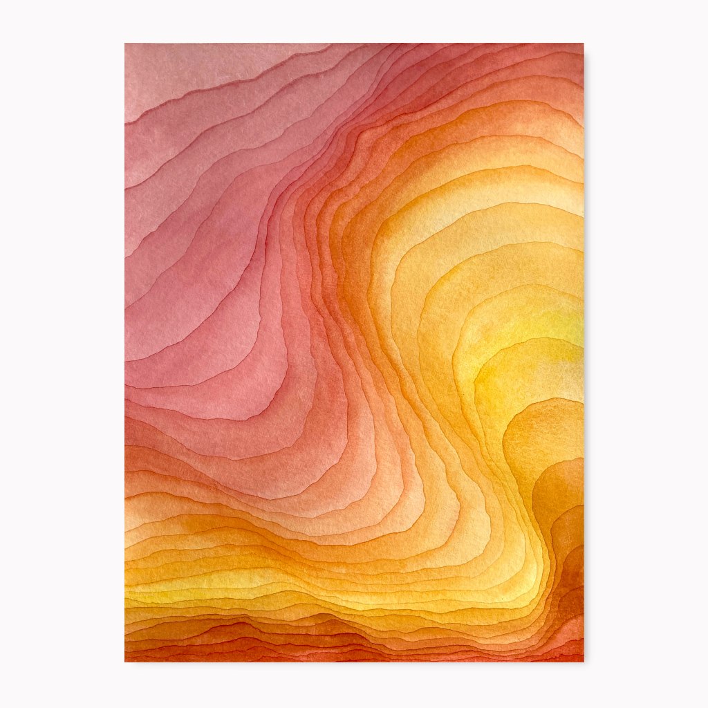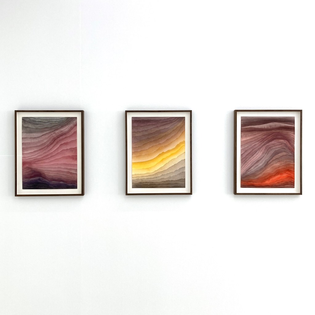 “There is an element of time that runs through Mikael Hallstrøm’s works whether they are watercolours, drawings, sculptures or other kinds of work. The watercolour paintings in the series Strata incorporates a double element of time: Strata is what geologists call the layers of earth that are differentiated by various sediments. These layers are used to research and establish climate changes and other natural events through time – and the actual painting takes time because he needs to wait for the underlying layer to dry completely before applying the next layer. Even though he determines the size of the work and the choice of which colours to use, Mikael Hallstrøm Eriksen does not plan how the actual layers of the finished work will end up – the painting is completed in a zen-like flow, almost as if it has a life of its own and the shifting layers grow organically in the process. His works are mainly abstract, but they are all inspired by actual phenomena: the sun, the earth, and the universe.” (text by Marianne Gross, akvarellen no. 3, 2023, published by The Nordic Watercolour Society)