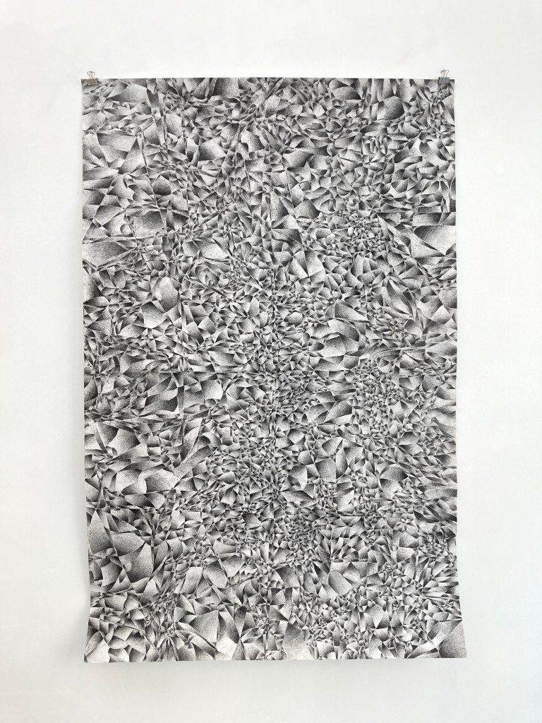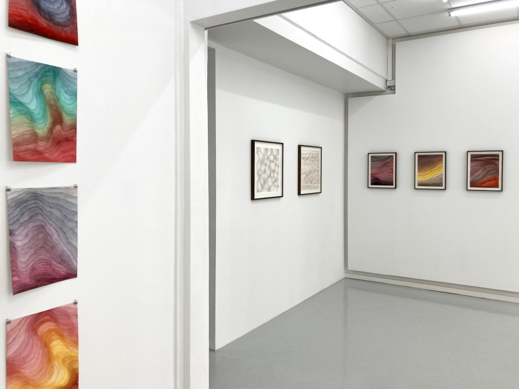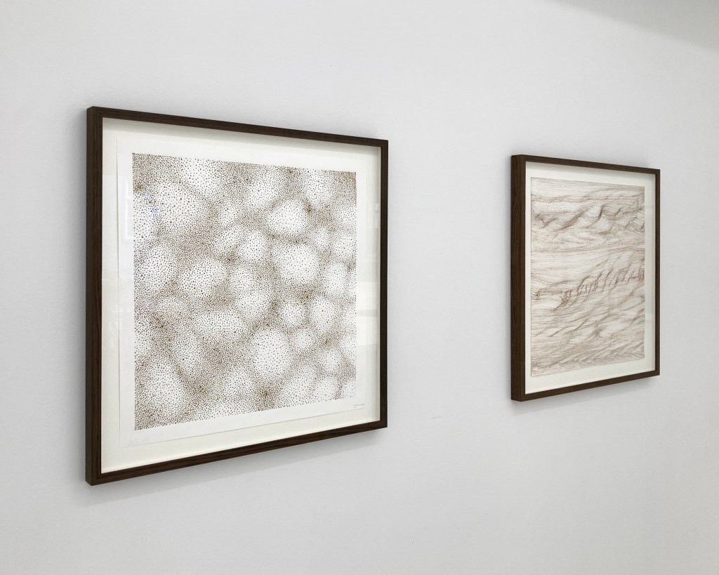 The exhibition Deep Time is a visual meditation on processes of accumulation and change. The works in the exhibition are inspired by processes of geological and cosmological becoming and draw on the imagery and visual representations of natural sciences such as geology and astronomy. The concept of ‘deep time’ denotes the vast cosmic time in which our ephemeral human time is embedded. The exhibition presents three bodies of work on paper – watercolour works, pencil drawings and burned drawings – all of which are the result of slow processes of extensive and accumulative mark-making.