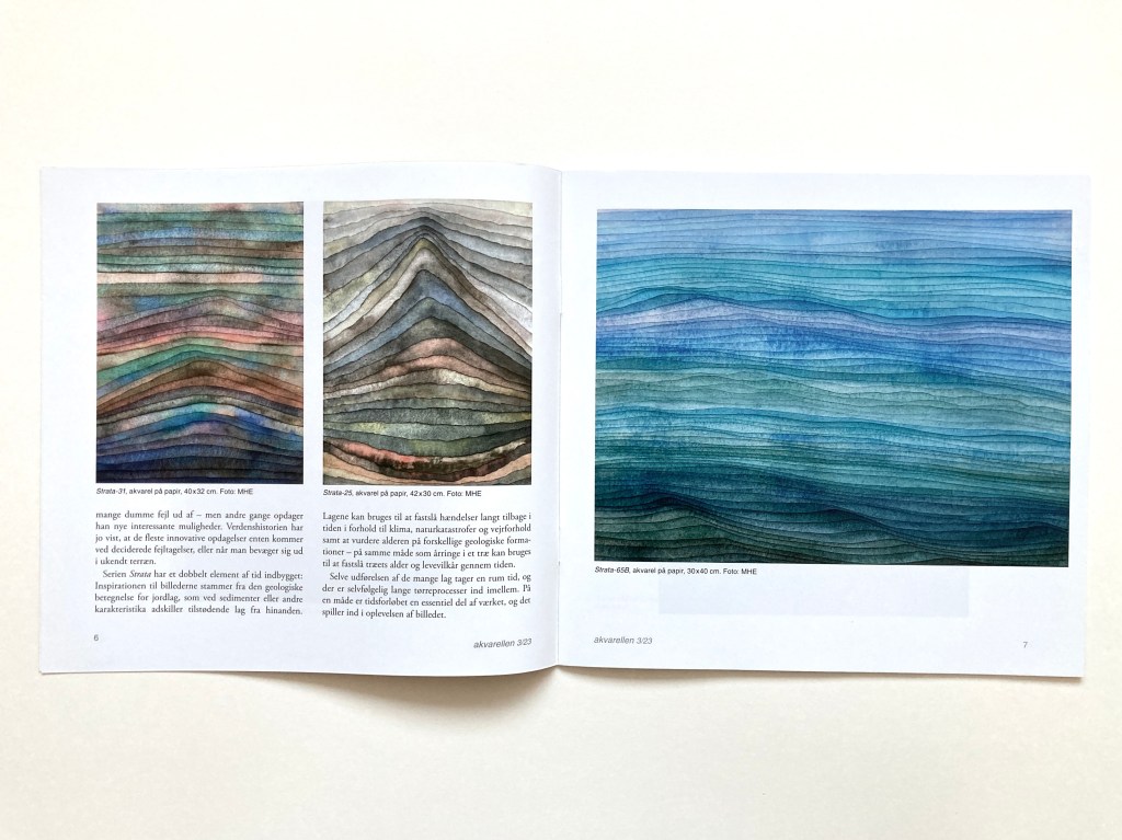I am very happy to have three Strata watercolour works featured in the August edition of Harper’s Magazine, one of the oldest cultural magazines in the US. The three works, Strata-25E, Strata-26B, and Strata-25, were originally shown at as part of Deep Time at Limited Works, Copenhagen, in April 2023.