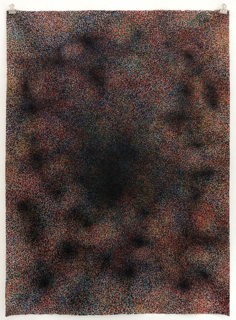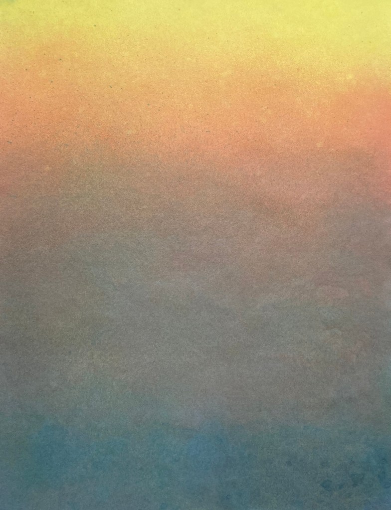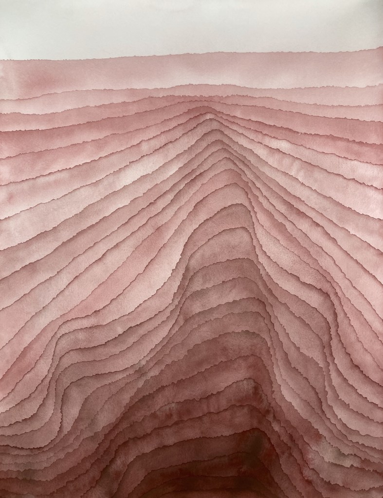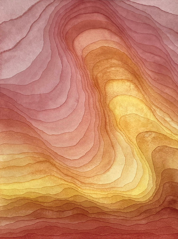 The works in the Strata-series are inspired by geological and natural phenomena – sediments, horisons, bodies of water, etc. These works explore a colourful imagery of accumulation, distance and transformation. Within geology and archeology, strata (singular: stratum) refers to layers (of rock, soil, culture etc.) possessing internally consistent characteristics making them distinguishable from each other.